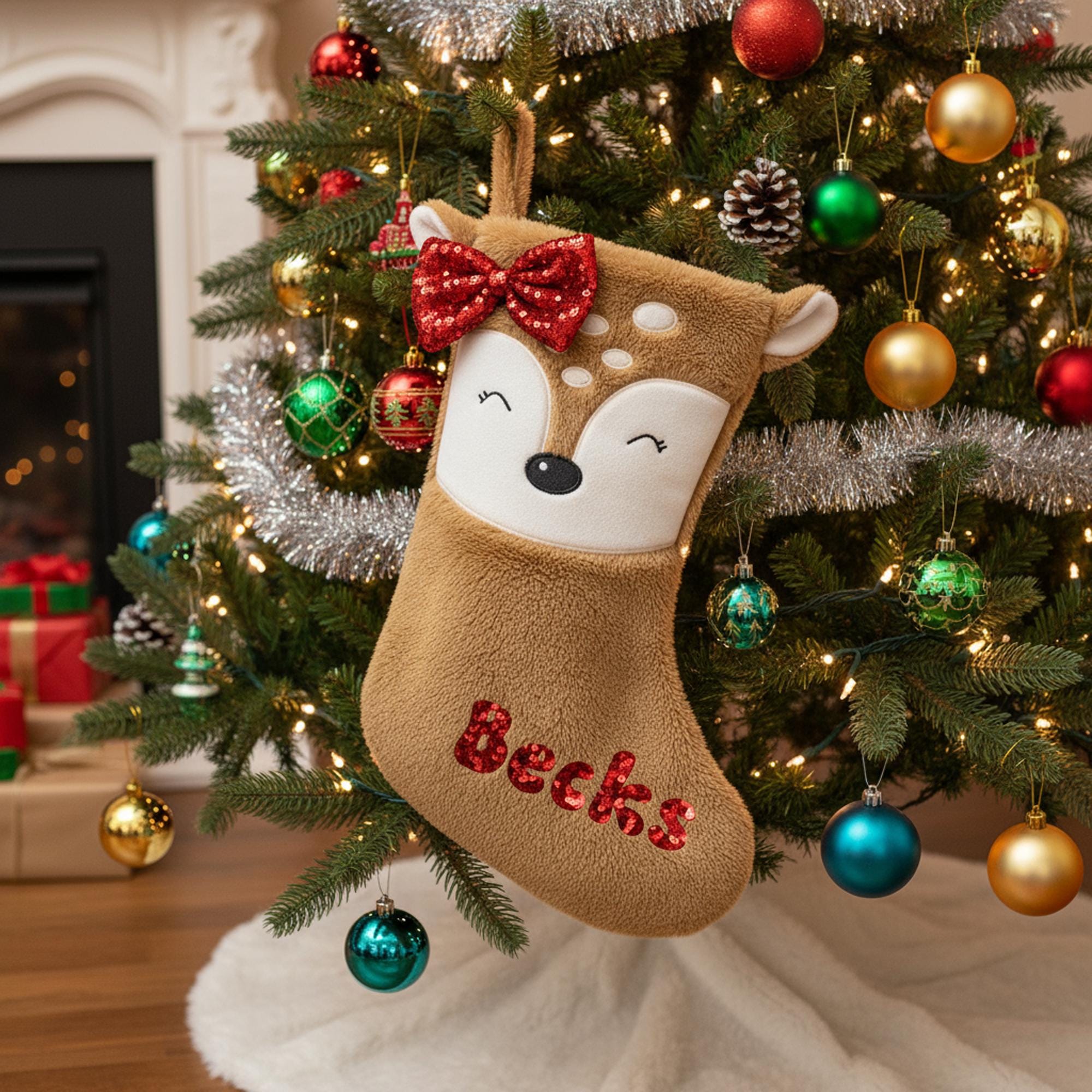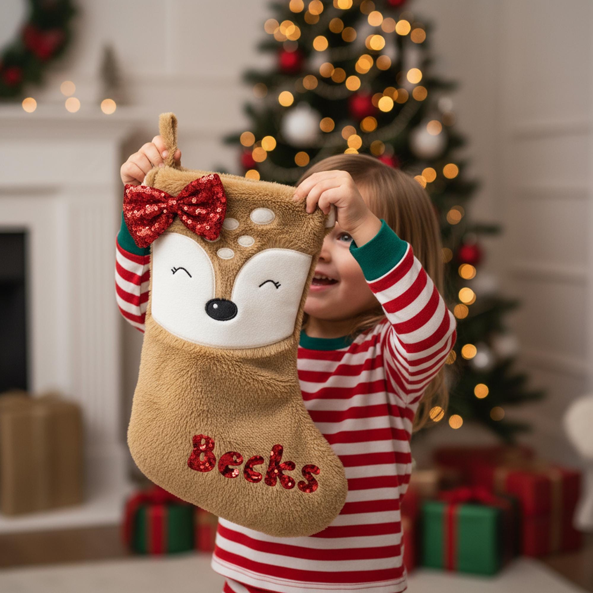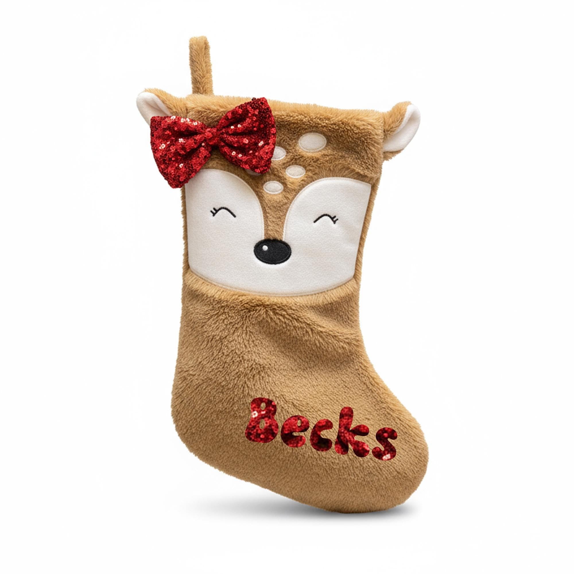 Personalised Christmas Stocking – Plush Reindeer Design for Kids, Custom Name