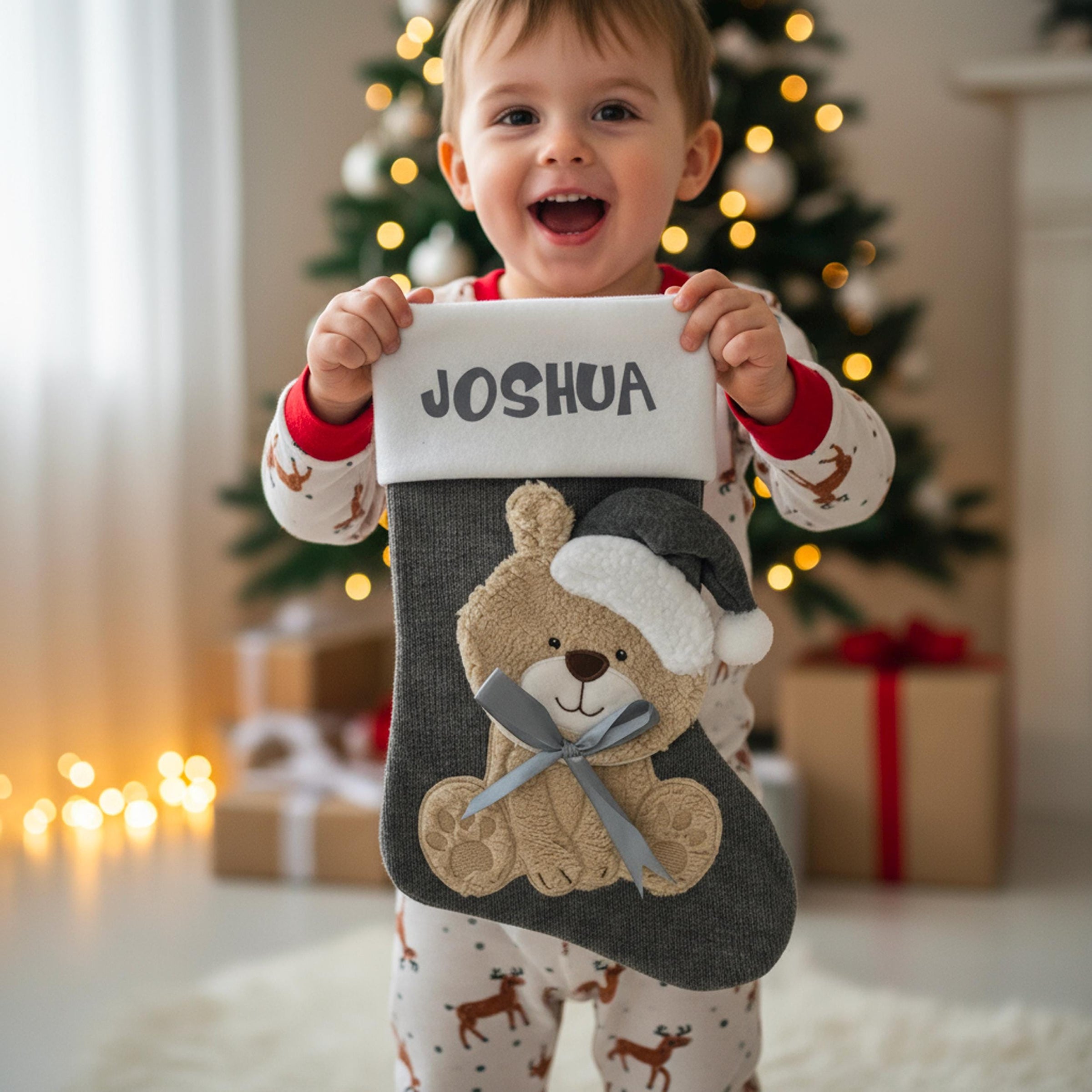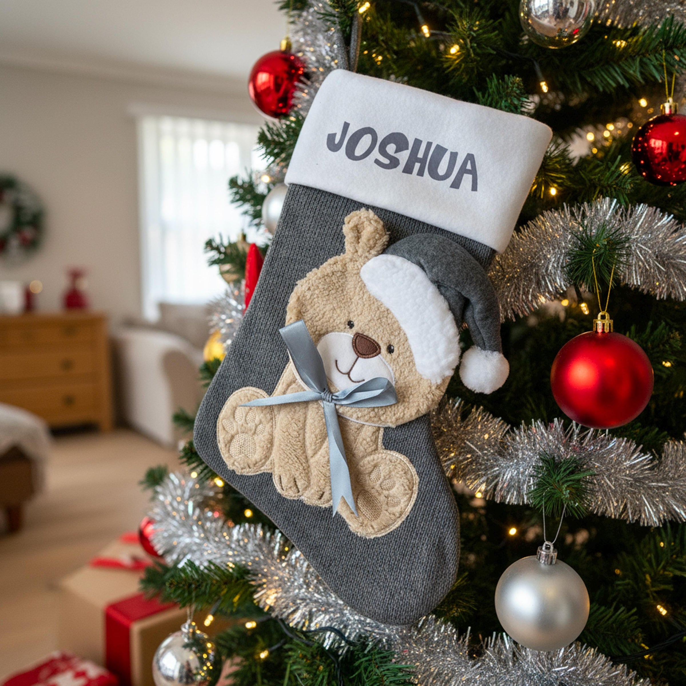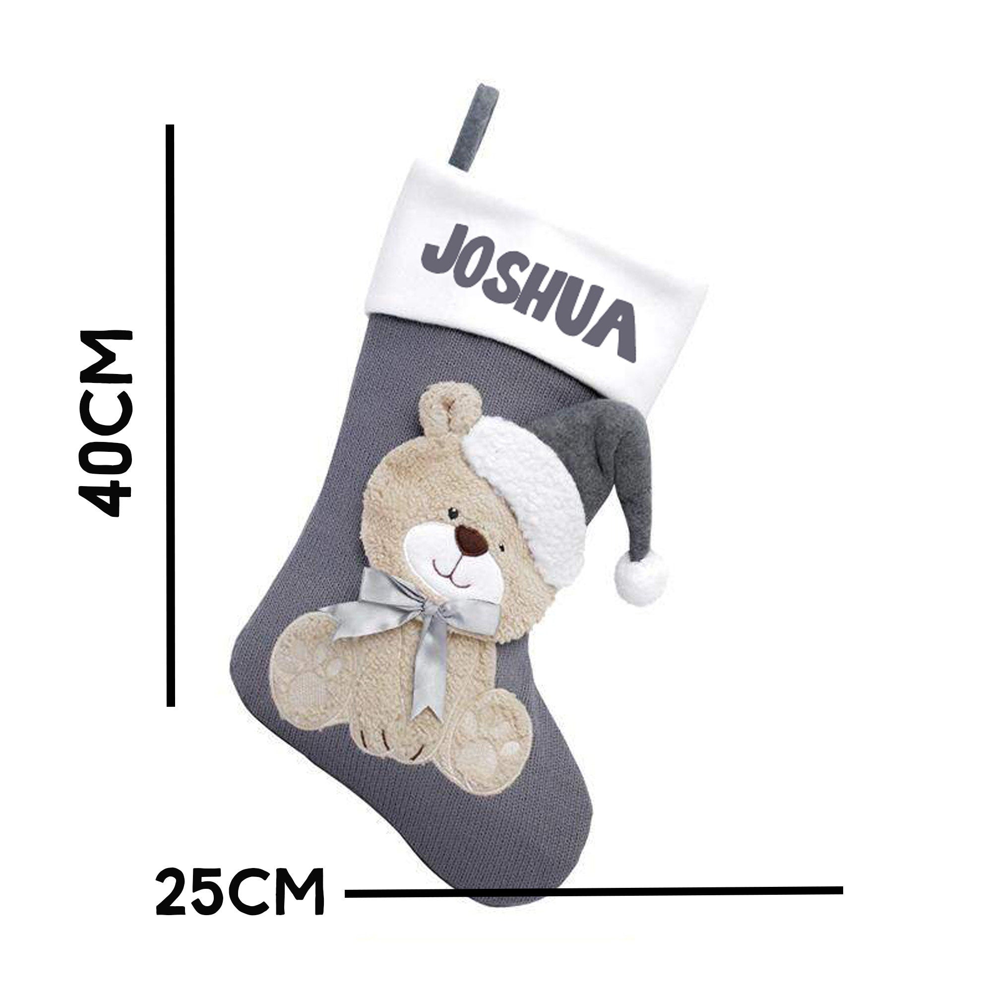 This personalized Christmas stocking is a charming knitted grey stocking featuring a plush teddy bear wearing a festive hat, perfect for kids to enjoy during the holiday season. Measuring 40 cm in height, 25 cm in width, with a 20 cm opening, this luxury lined stocking is crafted from 100% polyester for durability and softness. Personalize this custom name stocking by adding your child's name to make their Christmas morning truly special. The plush teddy stocking design adds a cute Christmas decor touch that doubles as a children’s holiday stocking and a holiday gift bag.