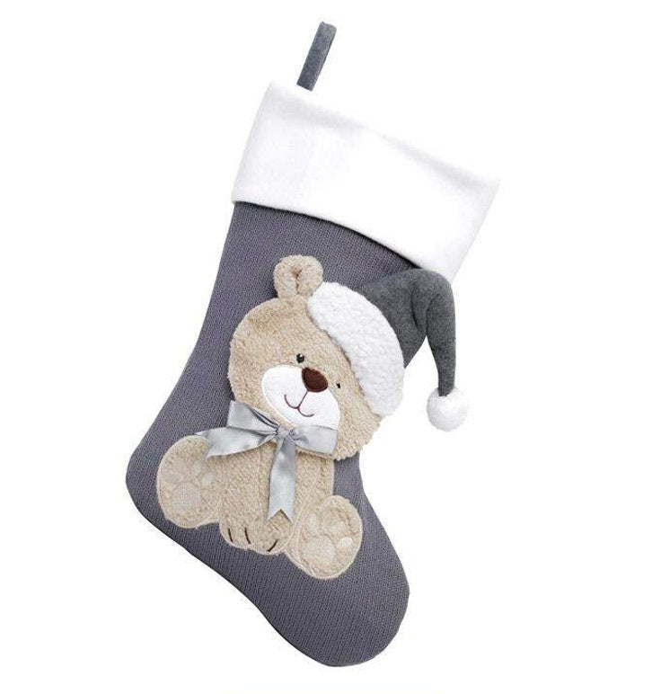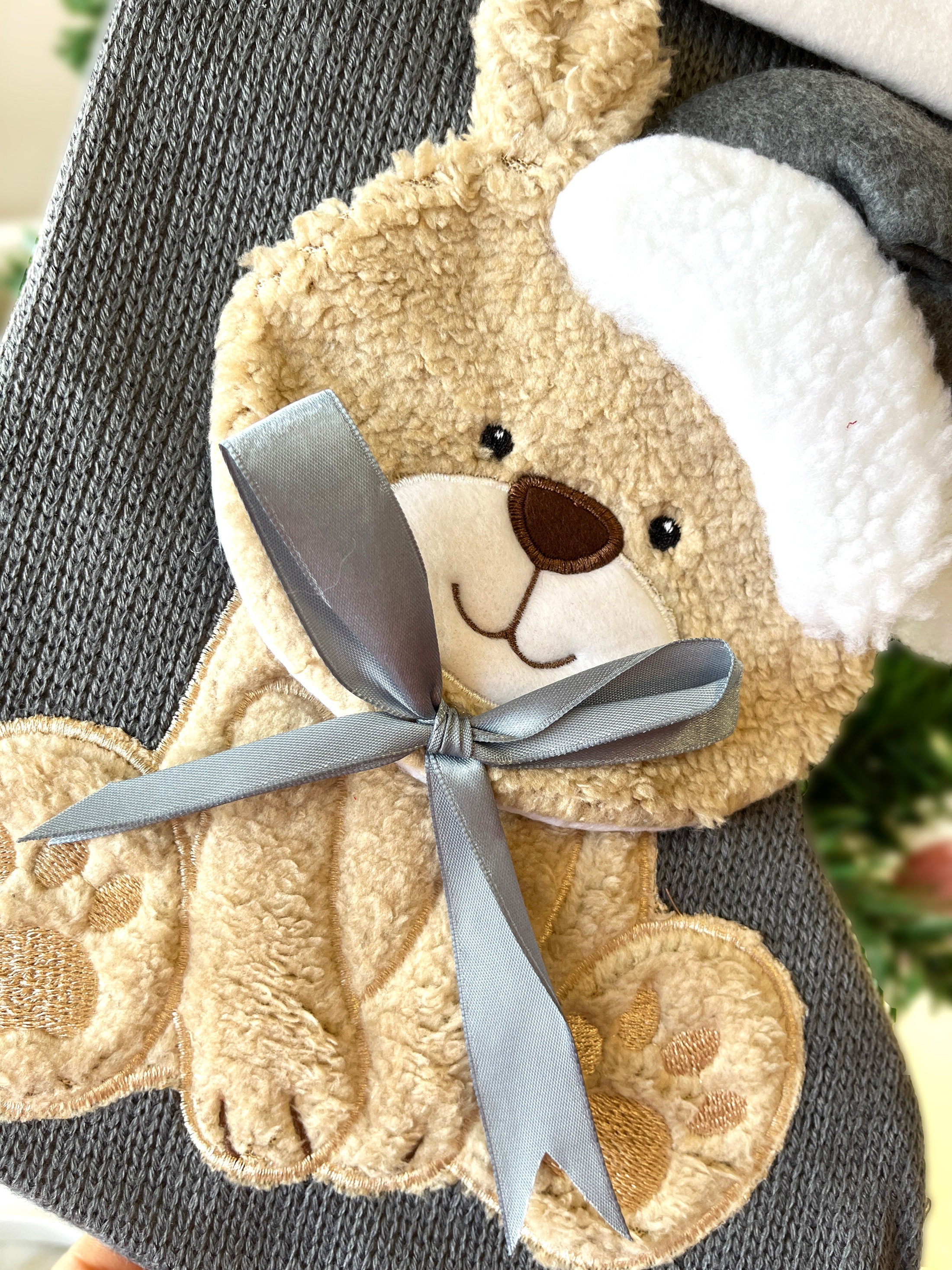 Personalized Christmas Stocking - Plush Teddy Bear Knitted Grey Luxury Lined Gift