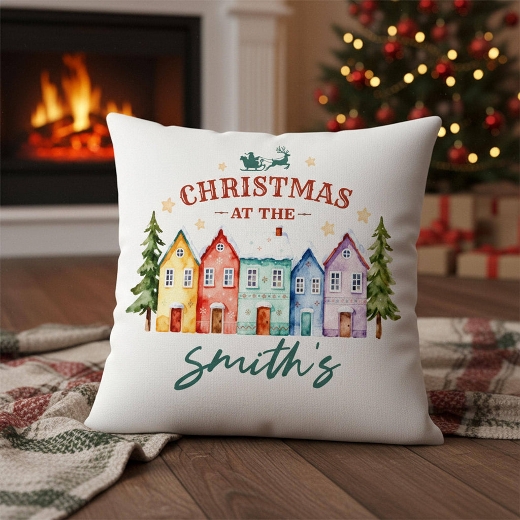 Personalised Christmas Cushion | Custom Family Name Pillow With Winter Village Scene
