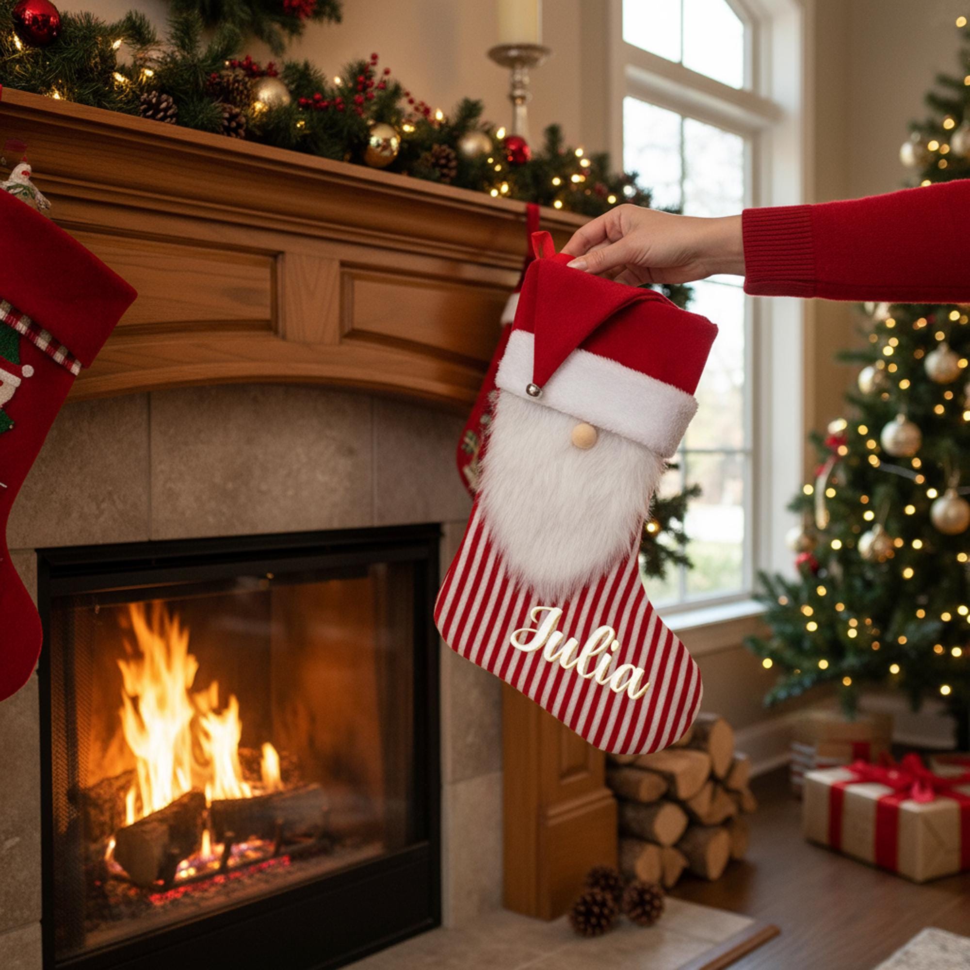 Our personalized Christmas stocking is a delightful addition to your kids holiday decor, designed as a plush gnome stocking that brings charm and festive spirit to any room. Measuring 40cm in height, 25cm in width, with a 20cm opening, this custom Christmas stocking features a soft plush texture that is perfect for holding holiday treats and gifts. The unique Santa beard design adds traditional warmth, making it an ideal personalised kids stocking that will become a cherished part of your holiday mantle decoration and festive fireplace decor.