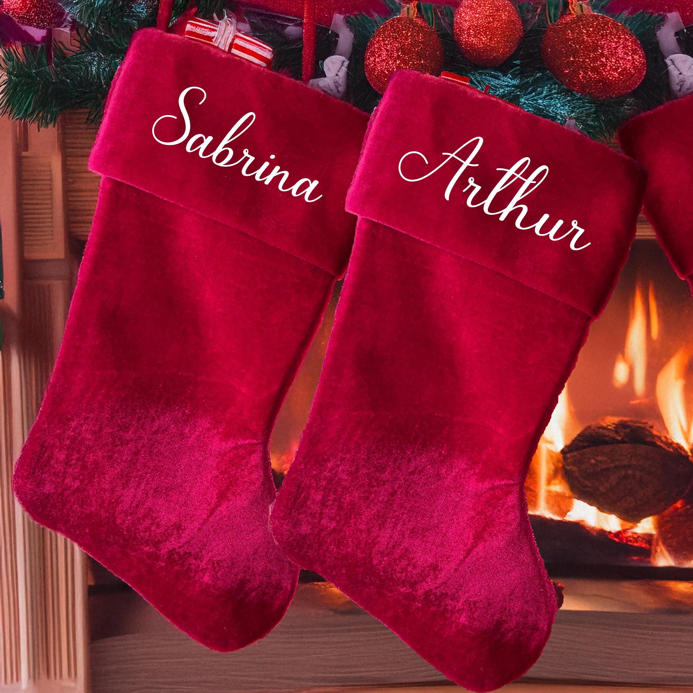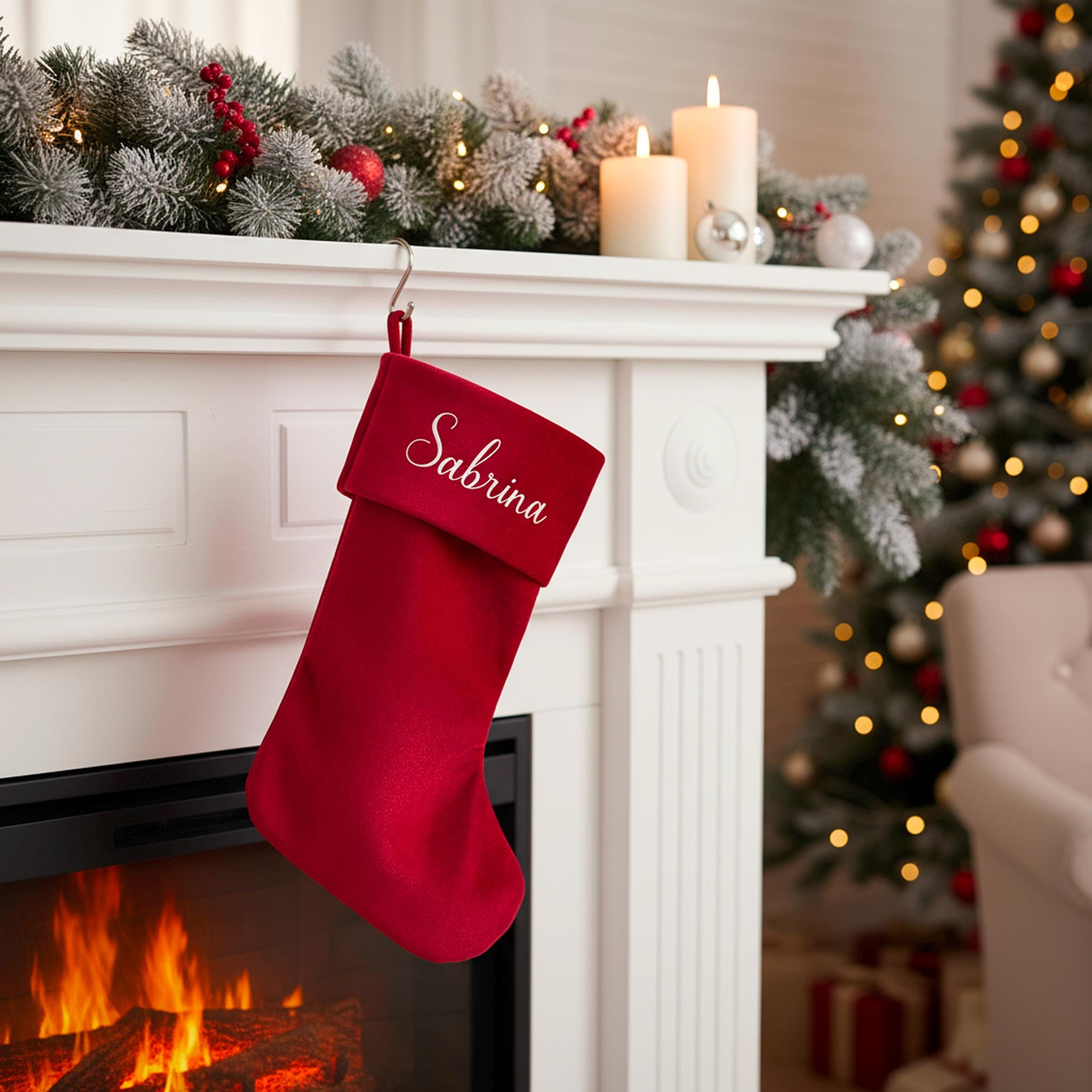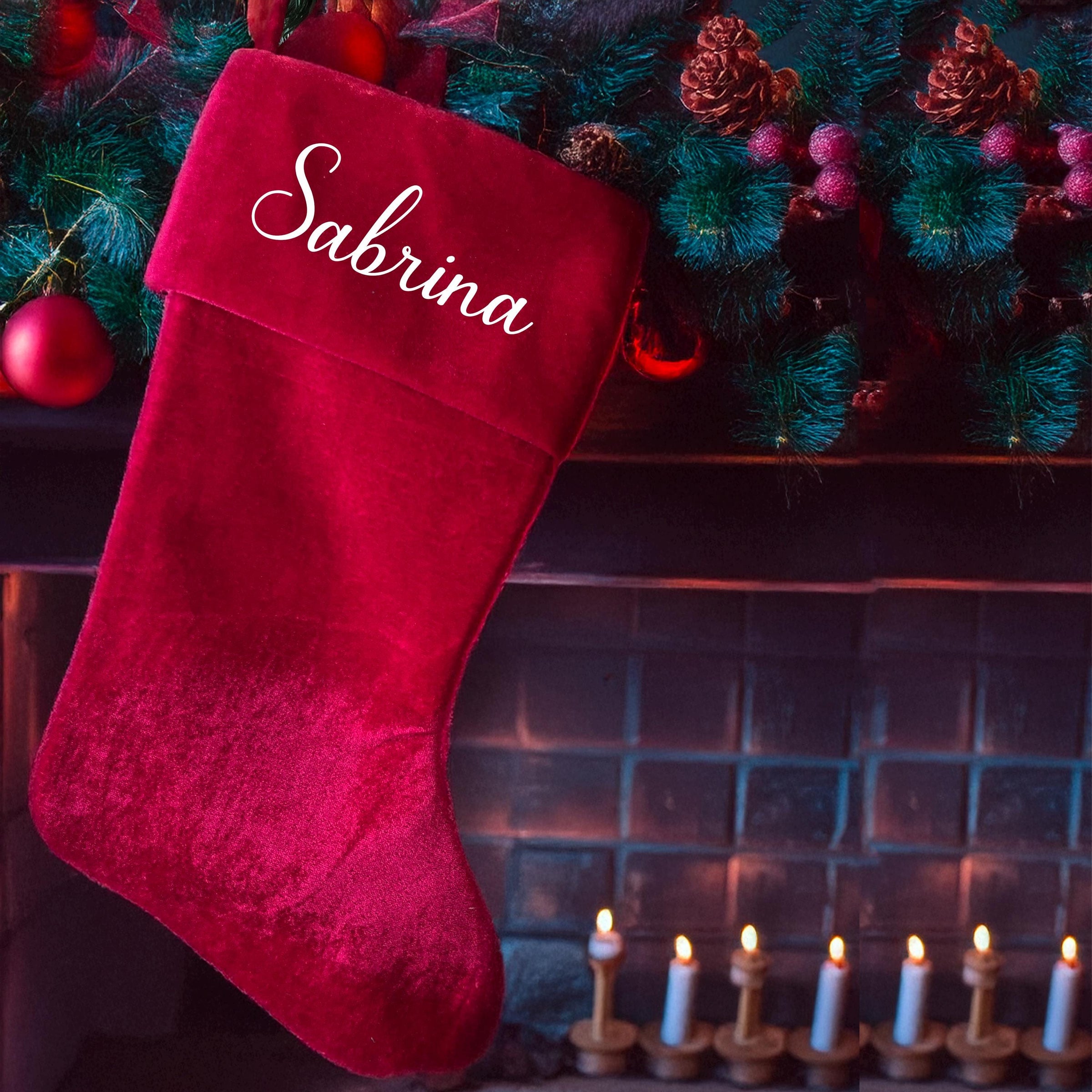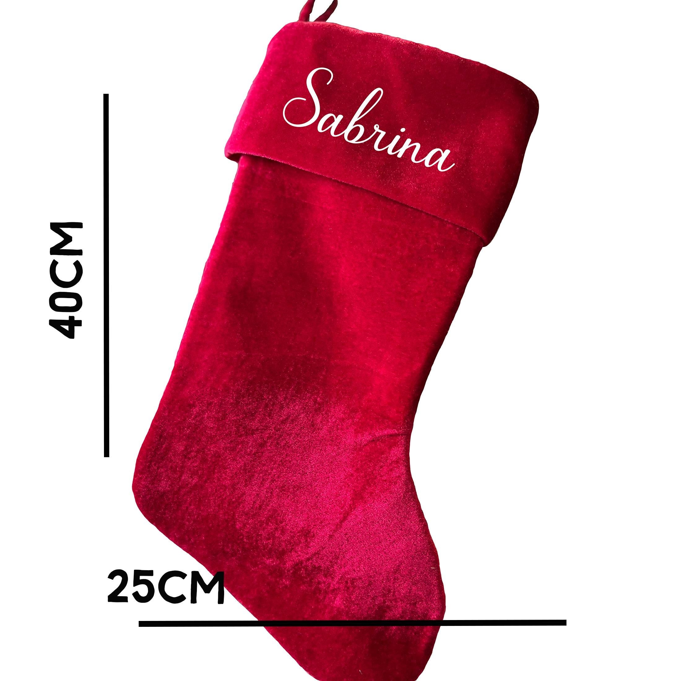 This personalized red Christmas stocking is the perfect festive accessory to enhance your holiday decor while providing a charming Christmas gift holder. Crafted from 100% polyester, this lined velvet stocking measures 40cm in height, 25cm in width, with a 20cm opening, offering ample space to hold Christmas Eve gift bags and holiday treats. Featuring a personalised name stocking option, you can customize the stocking with your choice of white, glitter white, or glitter gold text, making it a standout piece of custom holiday decor that adds a traditional Xmas decor touch to any fireplace hanging sock setup.