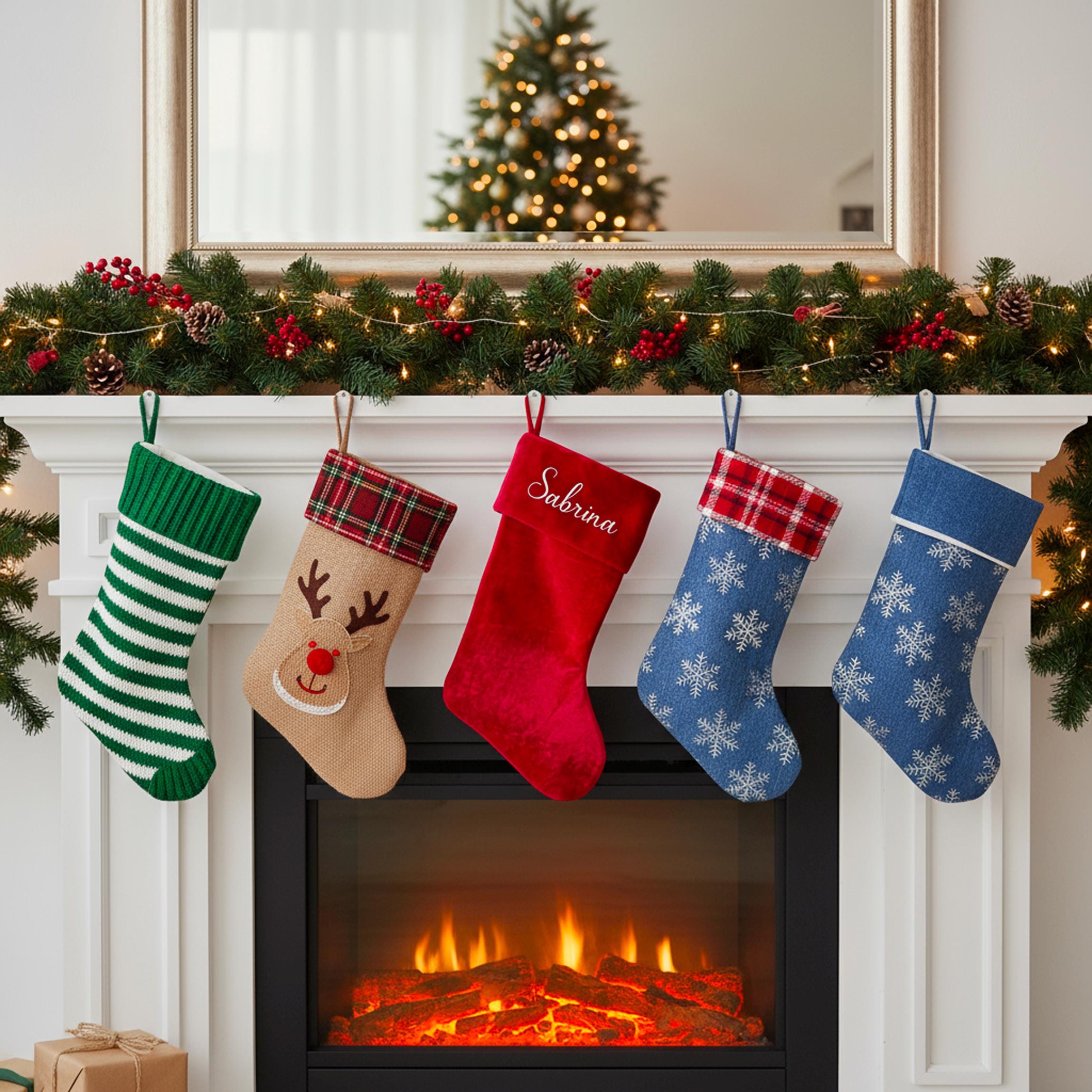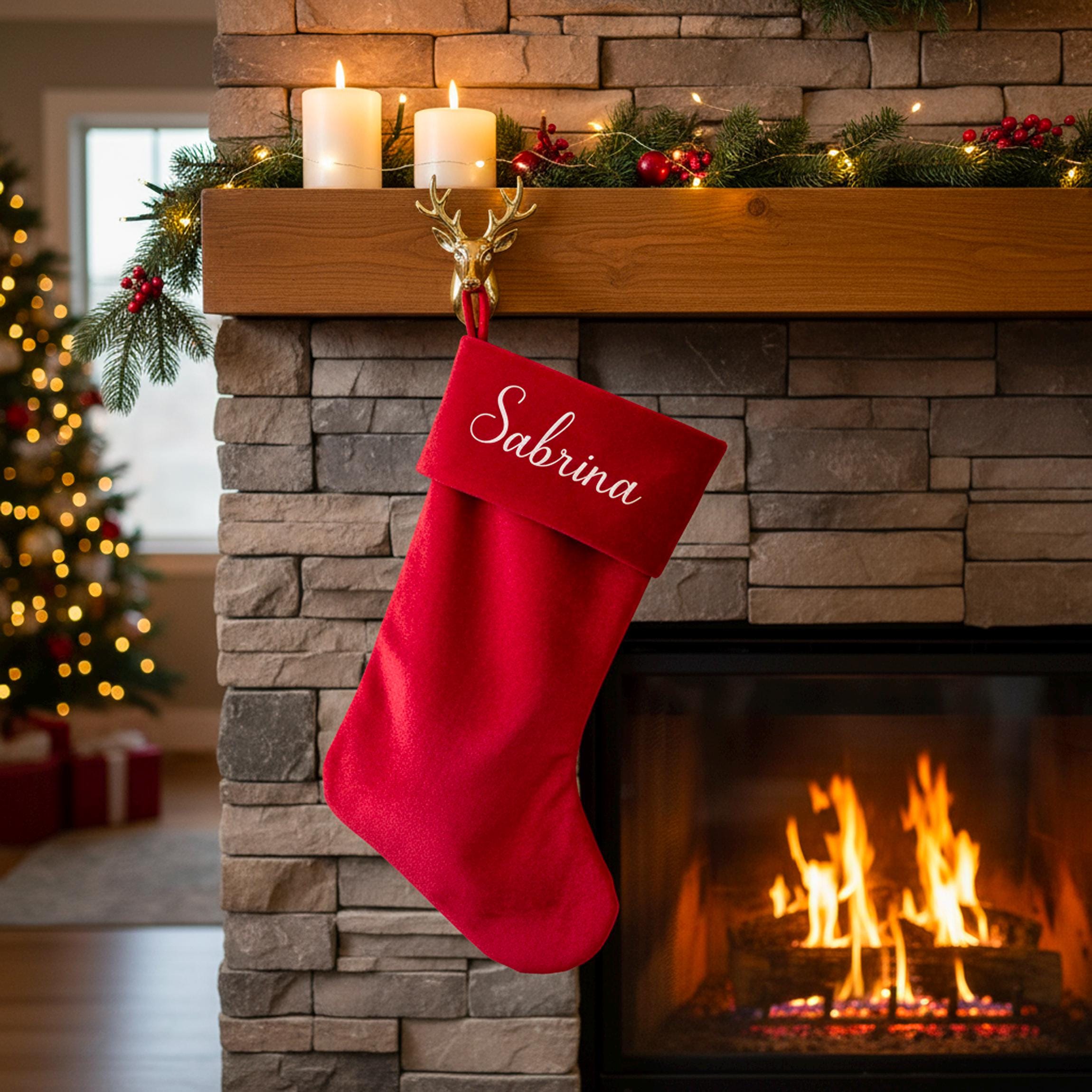 Each red holiday stocking is designed to combine beauty and function: the sumptuous lining protects gifts and adds durability, while the glitter name stocking personalization creates an eye-catching festive stocking decoration. This custom Christmas stocking is not only a decorative piece but also serves as a practical holiday gift sack for storing presents and treats during the season. Backed by positive customer reviews praising its quality and charm, this personalised name stocking brings joy and warmth to your celebrations.