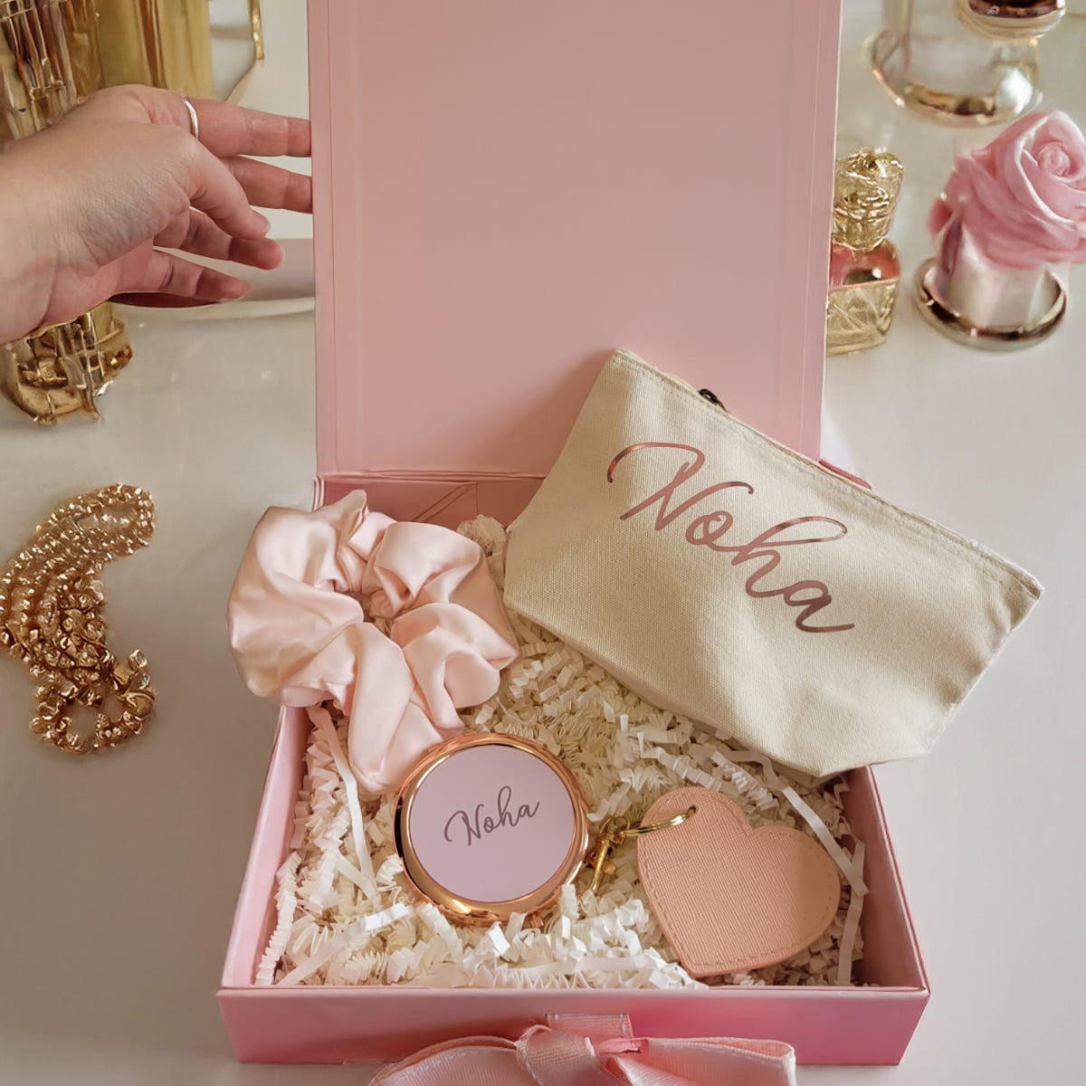 Each component of this personalised accessories collection is chosen to provide both beauty and practicality. The silk scrunchie delivers gentle hold and comfort, while the canvas accessory bag features reinforced seams for long-lasting use. The heart keychain gift adds a unique touch of personality, made from high-quality PU leather tested for wear resistance. The rose gold mirror is lightweight yet sturdy, ideal for carrying in handbags or pockets. This gift set for her is perfect for birthdays, anniversaries, or special occasions where thoughtful style matters.