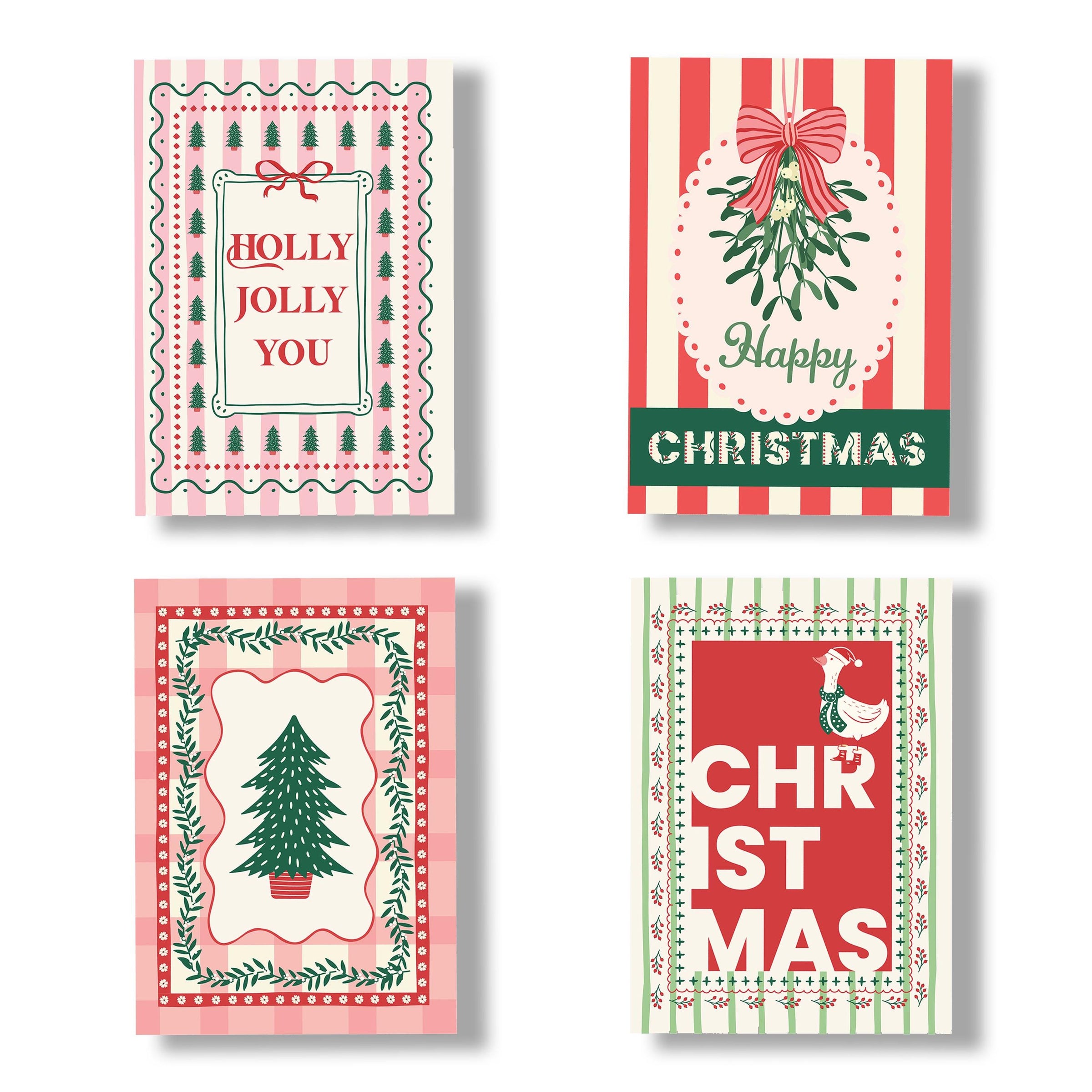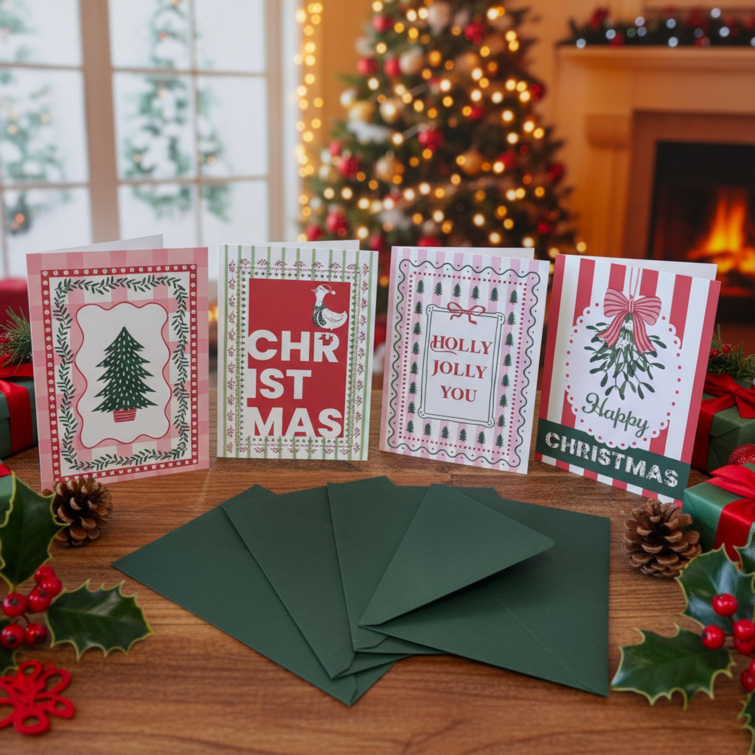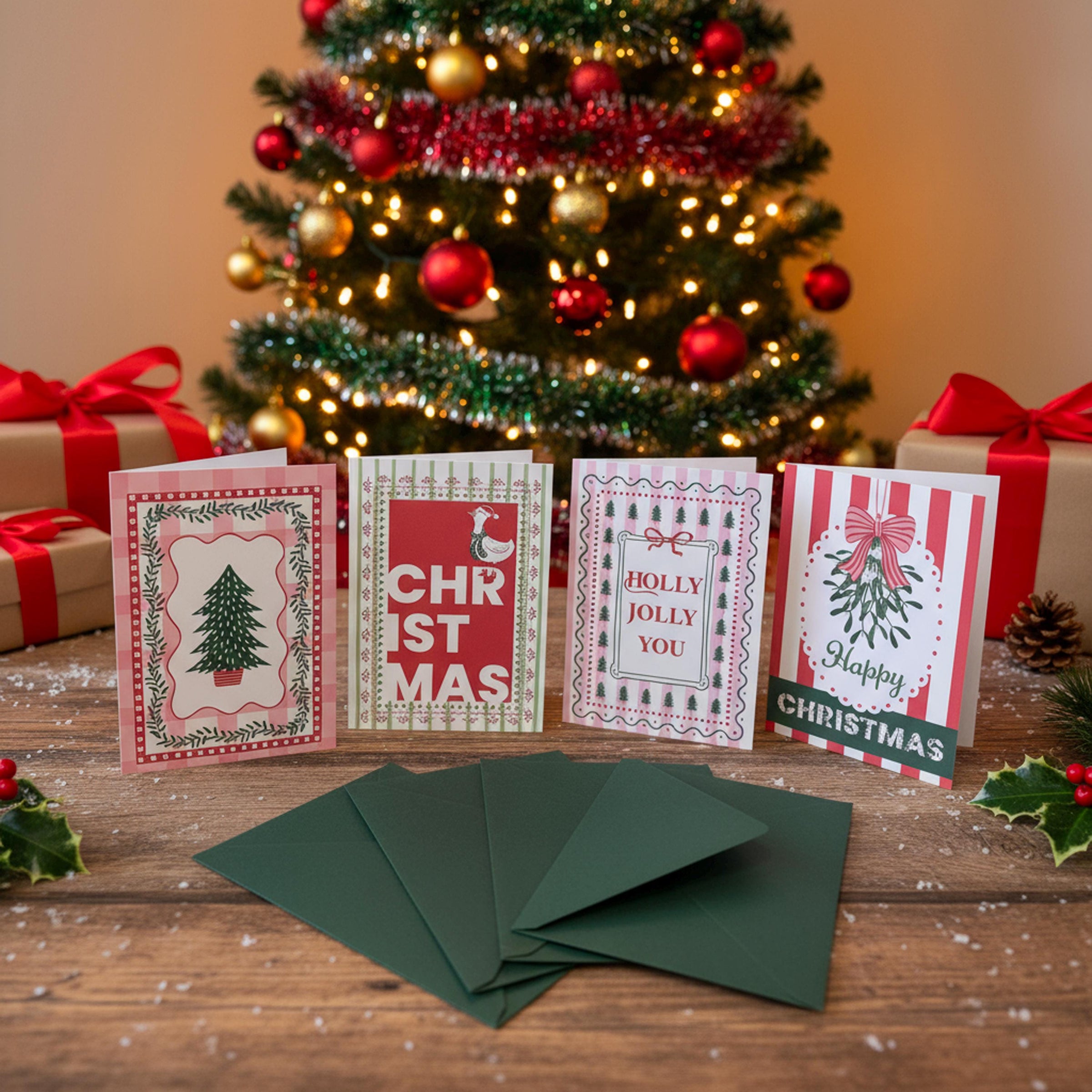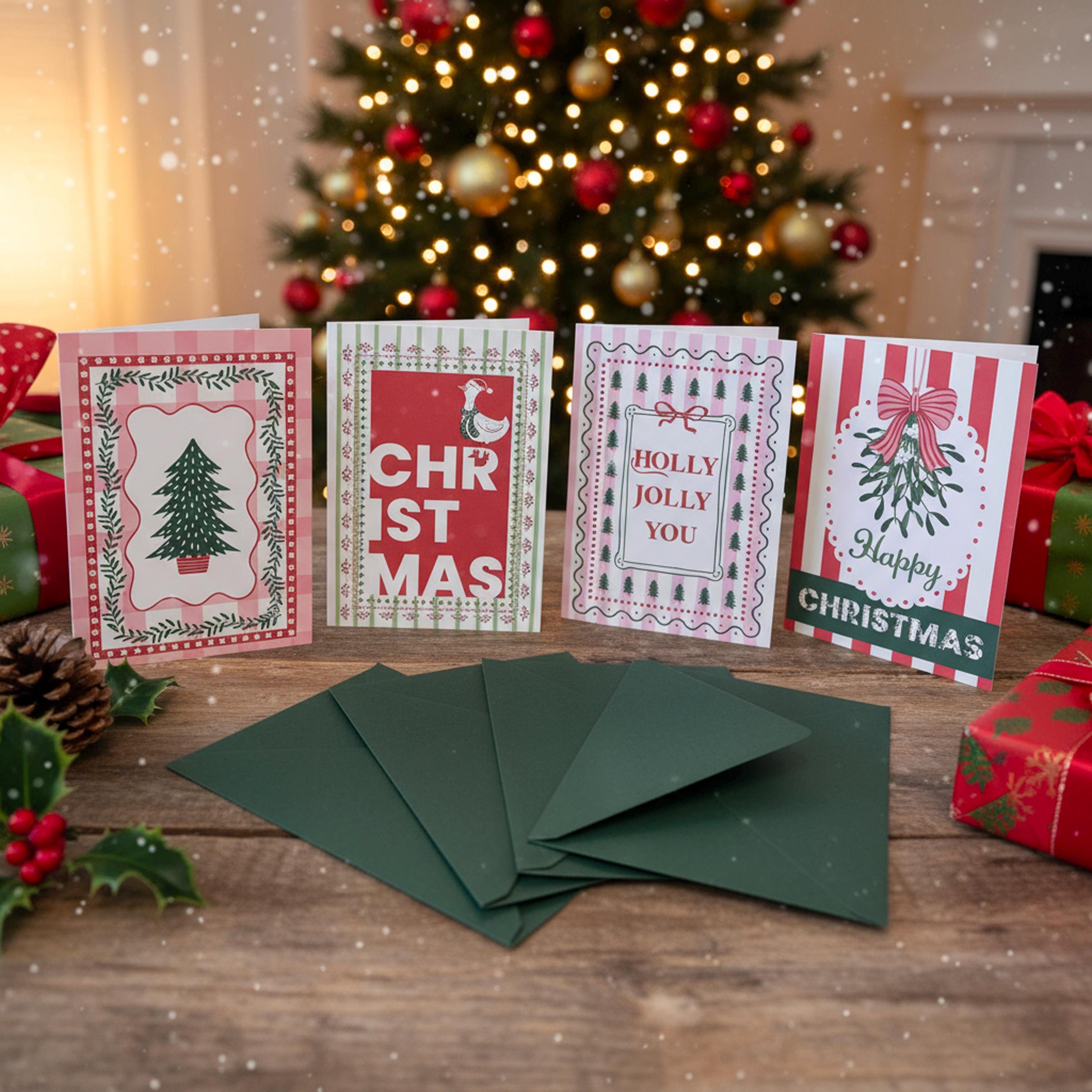 Retro Christmas Cards - Holiday Greeting Cards Set 4-Pack with Envelopes & Stickers